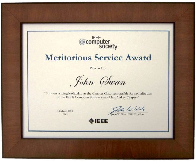 These awards were for "Outstanding leadership as the Chapter Chair responsible for revitalization of the IEEE Computer Society Santa Clara Valley Chapter." For more information, see John's LinkedIn Profile.