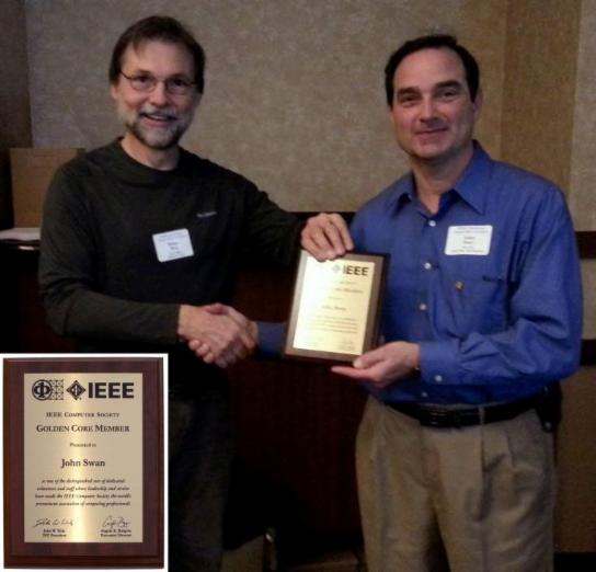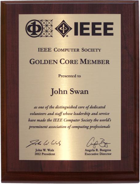 John was Awarded the 2012 Golden Core Award (photo below) from the IEEE Computer Society in January, 2013. This prestigious Award was given to fewer than 30 individuals in 2012 from the 80,000 member Computer Society. In early 2012 he was awarded the Meritorious Service Award, also from the IEEE Computer Society. (see IEEE-CS article).