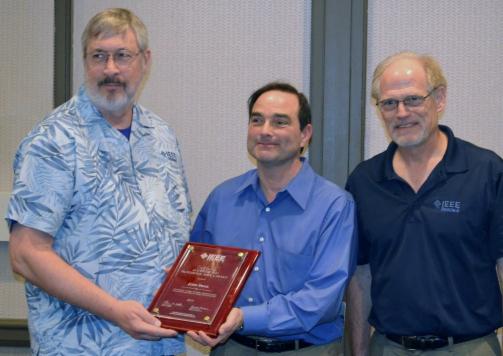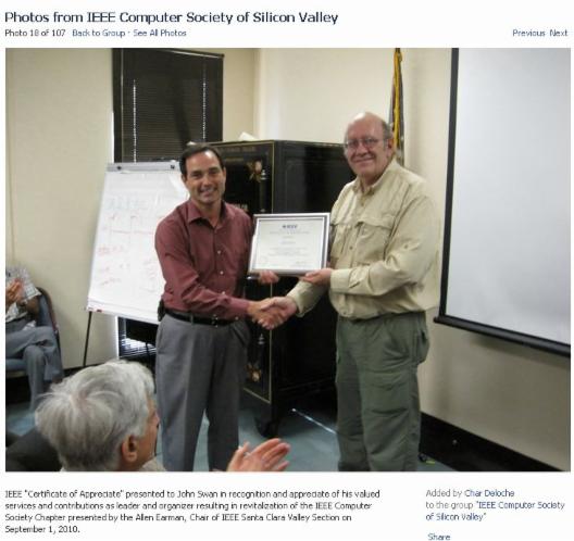 Below, John receives a Certificate of Appreciation from Allen Earman, Chair of the Santa Clara Valley Section, in 2010 as local recognition for his efforts in revitalizing the Computer Society Chapter. This photo was posted to the Chapter's Facebook Group.